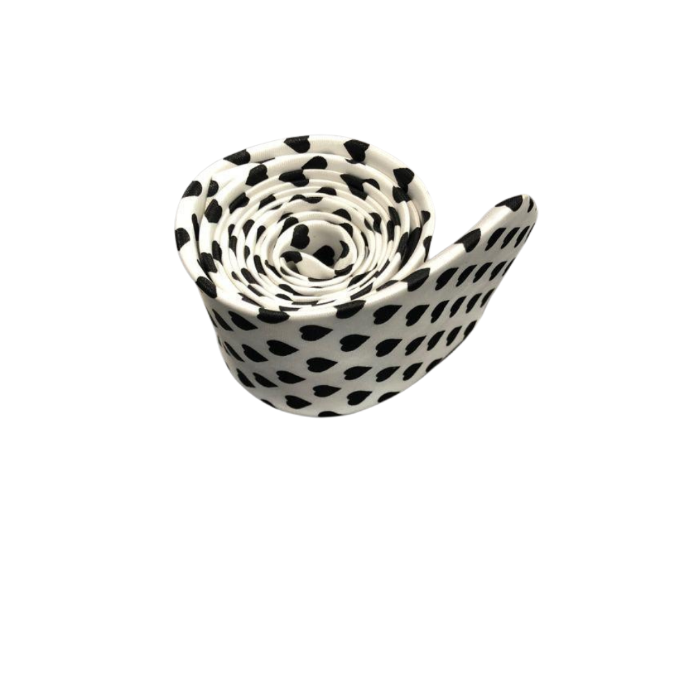 Une cravate est roulée. Elle est blanche et ornée d'un motif répétitif de cœurs noirs. Ces derniers sont petits et uniformément répartis sur la surface. La cravate présente une forme de spirale lâche, avec une extrémité légèrement déployée.