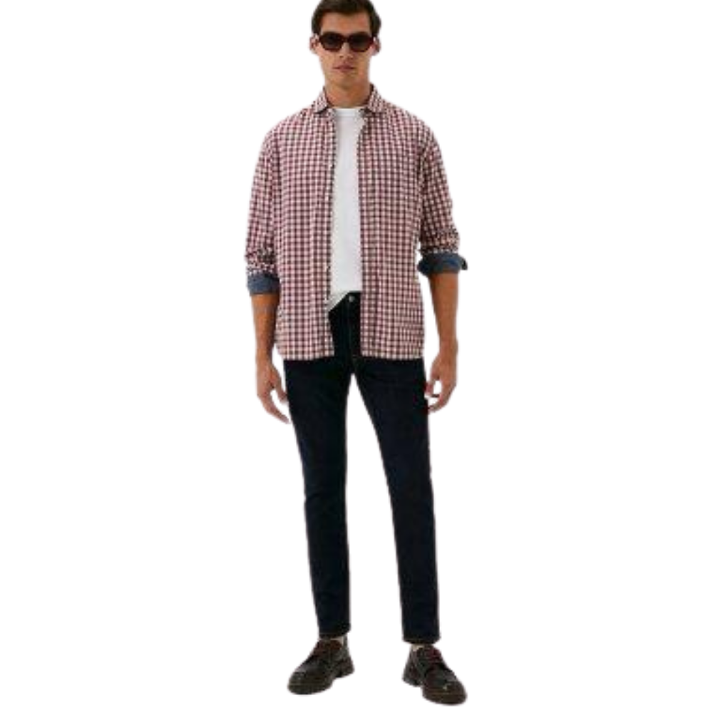 Jean droit délavé foncé. Jean, de couleur bleu marine foncé ou noir, semble être en denim. Il est ajusté, mais pas moulant, et sa jambe est légèrement fuselée. Des coutures sont visibles.
