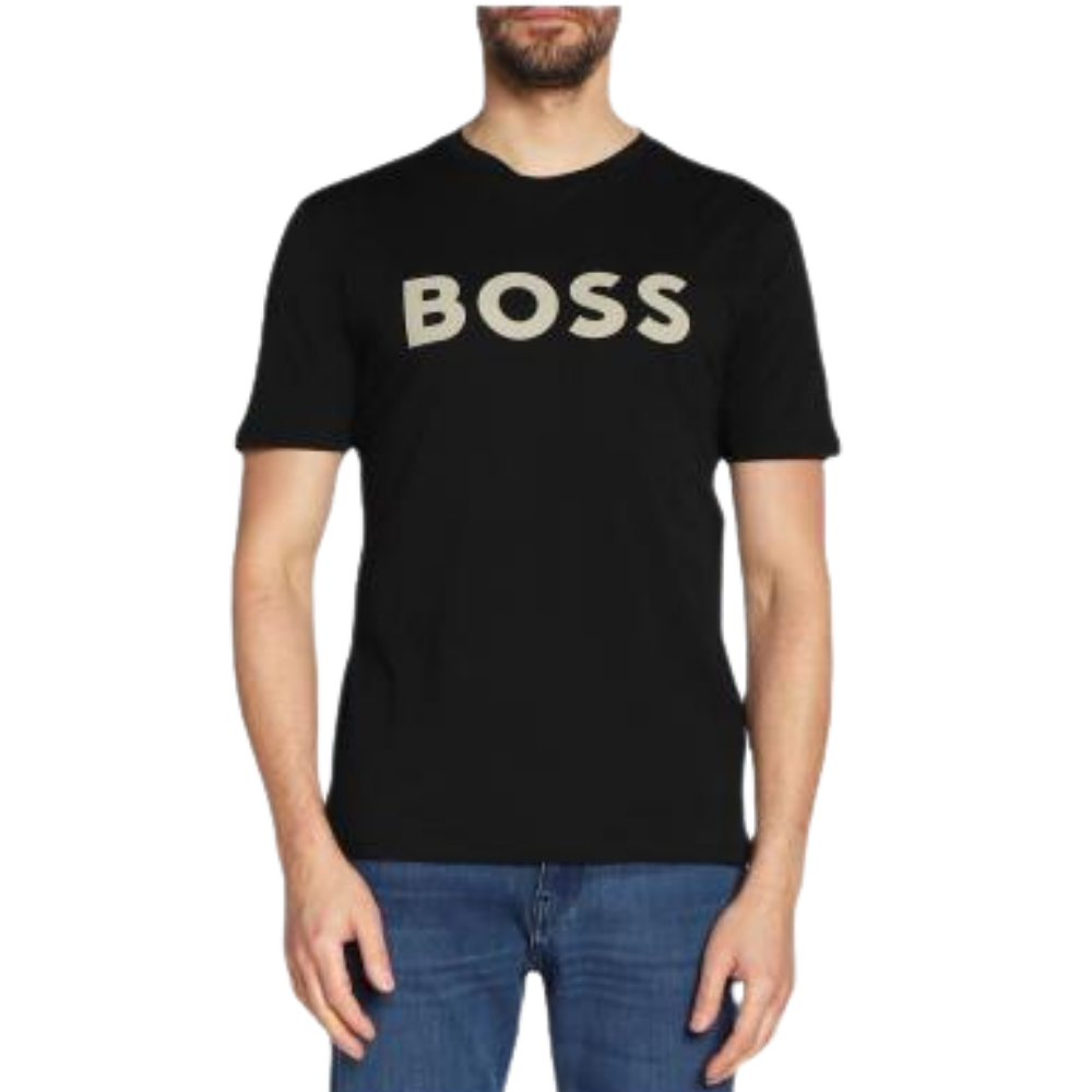 Un t-shirt noir « BOSS » est imprimé en caractères gras, majuscules, blancs et sans empattement au centre de la poitrine. Le t-shirt est un style à col rond standard avec des manches courtes en coton