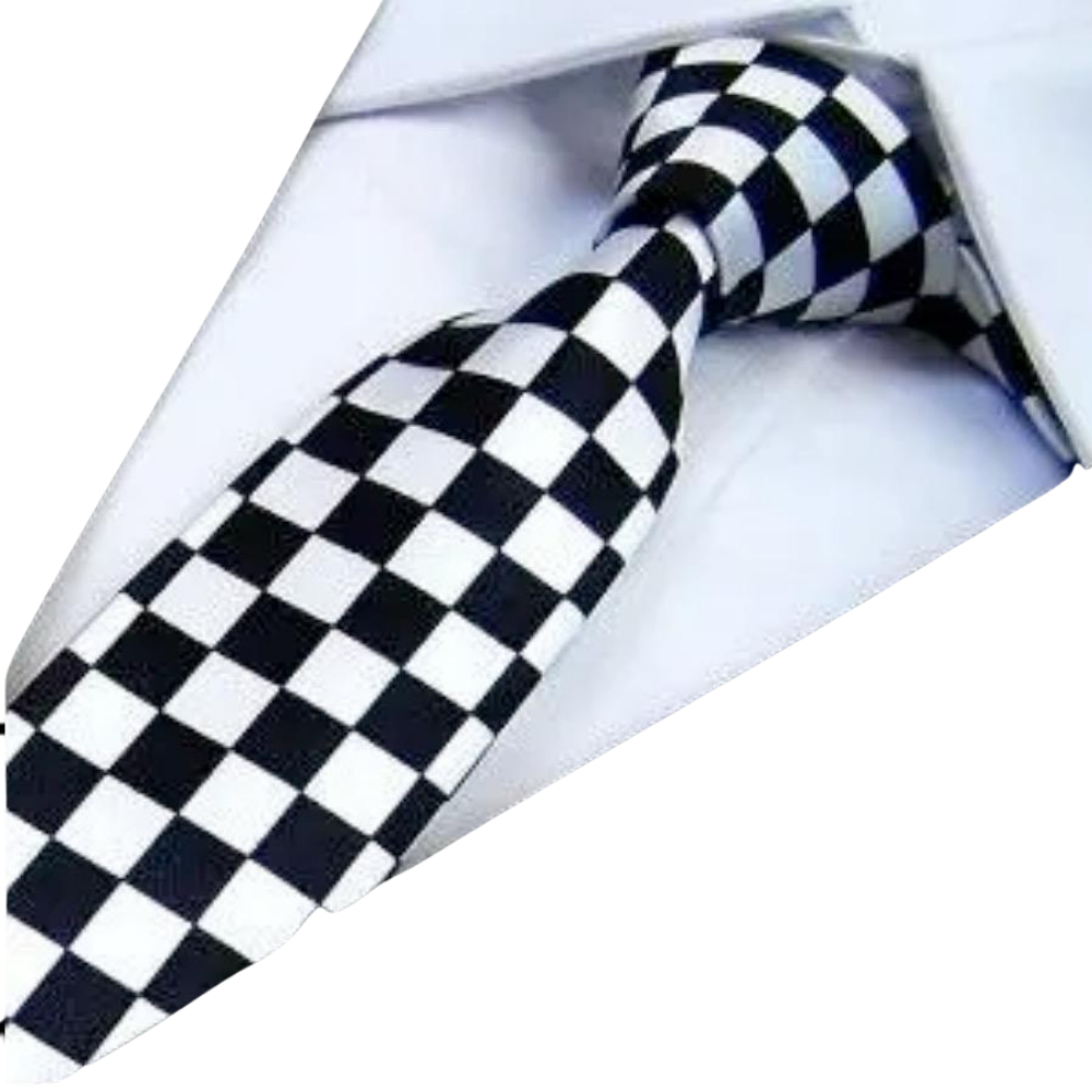 Cravate motif à carreaux noirs et blancs, avec des carrés de taille égale.